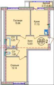 В продаже две планировки двухкомнатных квартир площадью 57 и 66 кв. м. Особенность обеих планировок — просторная гостиная, небольшая спальня и два санузла – основной и гостевой. Также к продаже доступны однокомнатная и трехкомнатная планировки.