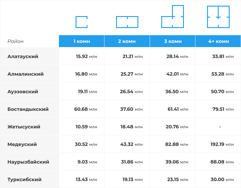 Самые дорогие 4-комнатные квартиры традиционно предлагаются в Медеуском районе, причем отрыв от других районов в июне составил более 100 млн тг. Самые дешевые 4-комнатные квартиры продаются в Алатауском районе.