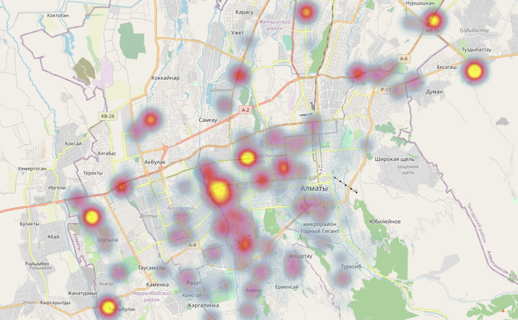 Тепловая карта популярности районов практически не поменялась за небольшим исключением – на карте появилась новая точка — район Акжар. Мы видим, что в июне резко возросла популярность этой локации среди потенциальных покупателей. Именно здесь возводится новый жилой комплекс класса комфорт. И хотя с инфраструктурой здесь есть определенные проблемы, зато хорошая экология и виды на горы нивелируют эти недостатки.