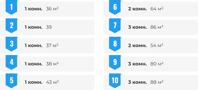 В десятку популярных планировок в июне вошли квартиры от 1 до 3 комнат. Тройку лидеров составили однушки площадью 36 кв. м, 39 кв. м и 37 кв. м. Трешки замыкают ТОП-10 планировок.