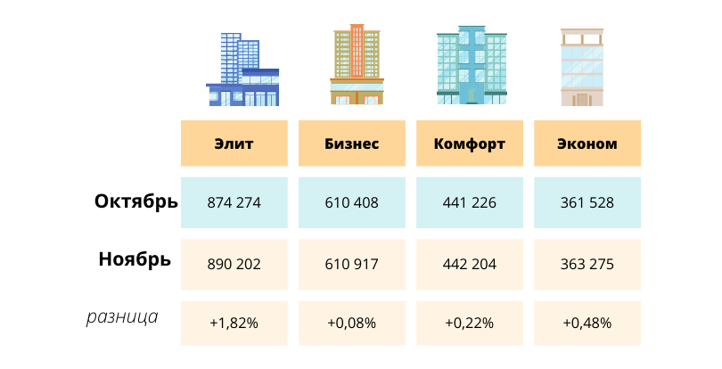 Қазақстанның астанасында күшті толқындар болған жоқ. Бағаның ең көп өскені эконом-класта болды, мұнда бір шаршы метрдің орташа құны 1,11%-ға өсті. Жайлылық сегменті ең аз өсімді көрсетті – плюс 0,59%, тіпті азғантай құлдырау басқа екі санаттағы тұрғын үйлер бойынша тіркелді: «бизнес» – минус 0,11%, үнемді тұрғын үйдің құны 1,26% төмендеді.