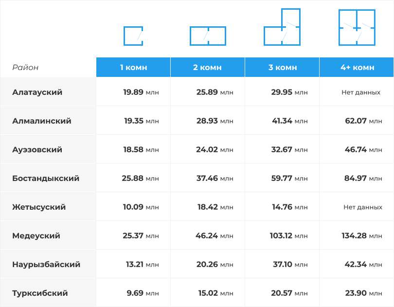 Қыркүйек айындағы ең қымбат пәтерлер – 4 бөлмелі тұрғын үй Медеу ауданы , мұндай пәтер үшін олар 124,38 миллион теңге сұраған. Ең арзан төрт бөлмелі пәтерлер ұсынылады Түрксіб ауданы , мұнда мұндай тұрғын үйді бір бөлмелі пәтерден де арзанырақ, анағұрлым тартымды аудандарда – 23,90 миллион теңгеге сатып алуға болады.