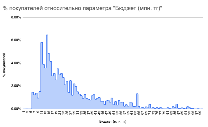 Бұрынғыдай сатып алушылардың негізгі пайызы баспана үшін төлеуге дайын 17 млн теңгеден аспайды , әлеуетті сатып алушылардың ең көп саны бюджетке сүйенеді теңге13 млн .