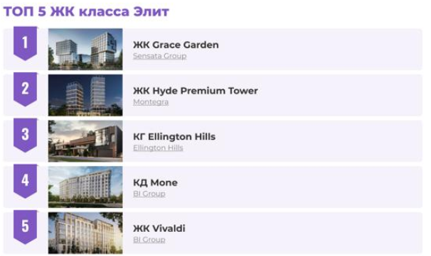Элиталық жобалардың ішінде көшбасшы болып Sensata Group компаниясының Grace Garden – футуристік сәулетімен және қызмет көрсету деңгейі жоғары кешен табылады. Сондай-ақ танымал бестікте: Hyde Premium Tower, Ellington Hills, Mone және Vivaldi тұрғын үй кешендері астанада жоғары өмір сүру деңгейін іздейтін сатып алушыларға бағытталған.