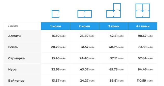 Байқоңыр төрт бөлмелі пәтер сатып алу бойынша ең қымбат аудан атанды – 110,59 миллион теңге. Оның үстіне мұнда үш бөлмелі пәтерлердің бағасы жоғары – 38,81 миллион теңге. Бұл санаттағы көшбасшы Нұра ауданы болса да, мұндағы құны 65,73 миллион теңгеге жетеді.