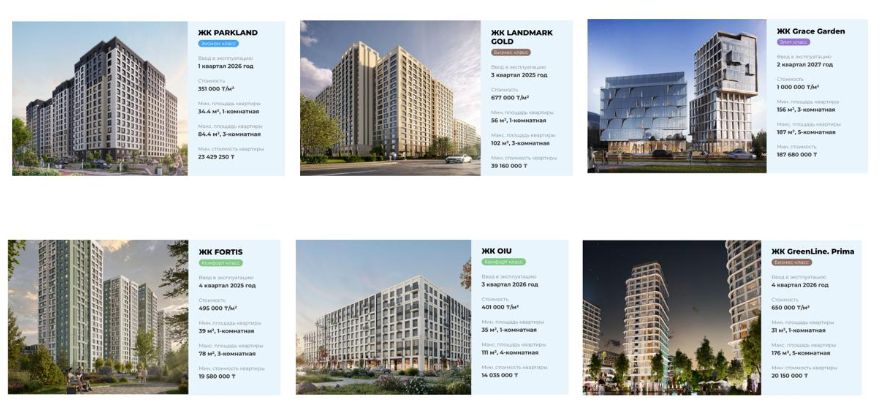 BI Group компаниясының PARKLAND тұрғын үй кешені эконом-класс сегментінде көшбасшы болып табылады. Қолжетімді бағаны заманауи сәулетпен үйлестіреді. Сондай-ақ Рио-де-Жанейро, Астана, AruPark және SPACE – бәсекеге қабілетті бағамен қарапайым жайлылықты ұсынатын жобалар.