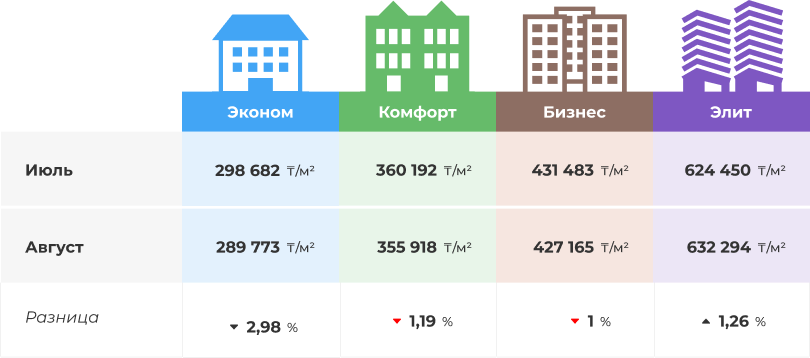 Дәстүрлі түрде Homsters.kz сарапшылары Қазақстандағы бастапқы жылжымайтын мүлік бағасының қалай өзгергені, сыныптары: «эконом», «комфорт», «бизнес» және «элита», 2022 жылдың шілдесі мен тамызы аралығында Алматы қалаларында деректер жинады. және Нұр-Сұлтан.