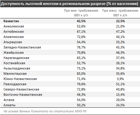 Яғни, ең оптимистік сценарийде (несие мөлшері – табыстың 50 пайызынан аспайды) тұрақты жұмыс істейтін қазақстандықтардың 42,5 пайызына ипотекадағы қарапайым бір бөлмелі пәтер қолжетімді болады. Неғұрлым қатаң талаптармен (несие мөлшері – табыстың 30%-нан аспауы керек) жеңілдікті ипотека тек жұмыс істейтін қазақстандықтардың 22,5%-ына ғана қолжетімді болады, ал егер қарыз алушының кәмелетке толмаған балалары немесе асырауындағы басқа адамдары, сондай-ақ ақшалай немесе тауарлық несиелері болса, одан да аз болады. . Әрине, ЕДБ міндетті шарттарында БЖЗҚ-ға үздіксіз жарналарды (алты айдан бастап) және жақсы несиелік тарихты қамтиды.