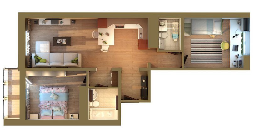 Жоспарлаудың тағы бір тәсілі: жатын бөлме мен ас үй – бір жең, ал екіншісі – зал және егер бар болса, басқа бөлме. Жатын бөлме мен ас үй арасындағы дәретхана.