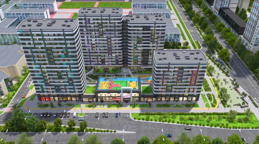 Кешенге 10, 14, 16 және 18 қабаттан тұратын 4 ғимарат кіреді. Әрбір кіреберіс спорттың қандай да бір түріне – футболға, тенниске, боксқа сәйкес стиль мен керек-жарақтарға арналған болады.