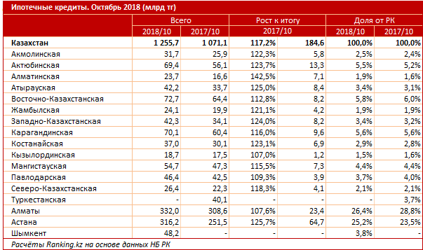 Алматы облысында бір жыл ішінде ипотекалық несие нарығы ақшалай түрде 42,5%-ға өсті. Астана, Атырау және Батыс Қазақстан облыстарында екінші деңгейлі банктер арқылы берілген ипотекалық несие көлемі көрсетілген мерзімде тоқсанға өсті.