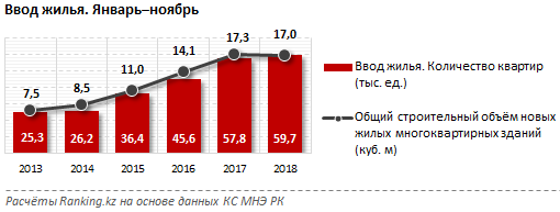11 айдың қорытындысы бойынша қазақстандық құрылыс салушылар көпқабатты үйлерде 59,7 мың жаңа пәтерді пайдалануға берді, бұл бір жыл бұрынғыдан 2 мыңға артық.