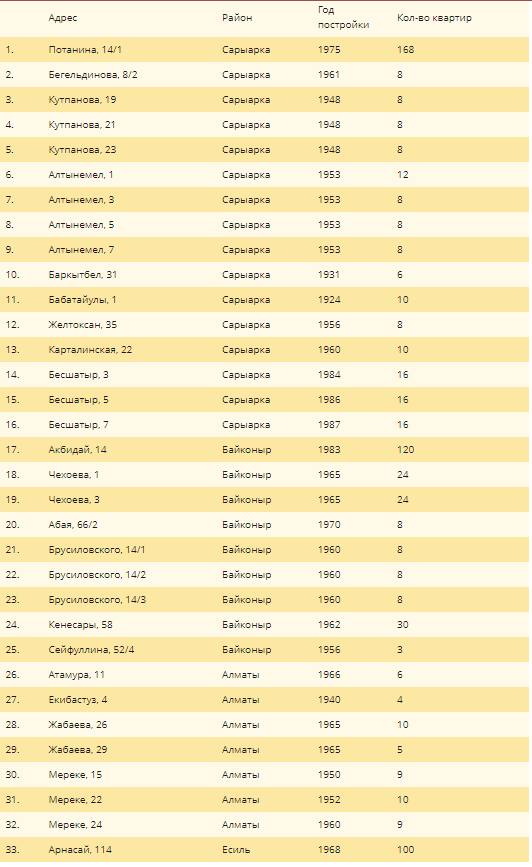 Тізімдегі үйлердің барлығы апатты жағдайда. Ең ескісі 1924 жылы салынған. 704 үй иесі жаңа пәтерге ие болады.