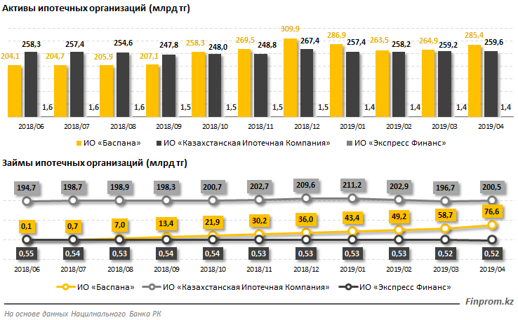 Ағымдағы жылдың сәуір айының соңында ипотекалық ұйымдардың жиынтық активтері өткен жылдың сәйкес кезеңімен салыстырғанда екі есеге артып, 546,3 млрд теңгеге жетті. Несие портфелінің активтердегі үлесі 50,8% немесе 277,6 млрд.теңгені құрады, сома бір жылда 47,1%-ға өсті. Көрсеткіштердің мұндай артуы 2018 жылғы маусымда Қазақстан Республикасының ипотекалық нарығында жаңа қатысушының пайда болуымен байланысты: «Баспана» ИҰ.