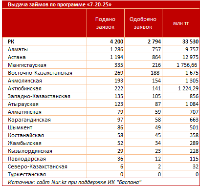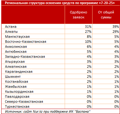 «7-20-25» бағдарламасы бойынша несиелердің шоғырлану деңгейі бұдан да жоғары. Екі ірі мегаполистің үлесіне ақшалай түрде берілген несиелердің 68%-ы (33,5 млрд теңгенің 22,7 млрд теңгесі) және мақұлданған өтінімдердің саны бойынша 58%-ы (2,8 мыңның 1,6 мыңы) тиесілі.