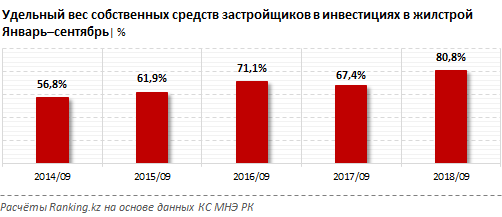 Однако велики риски, что инвестиционная активность в жилстрое не удержится в долгосрочном тренде. У застройщиков слабая поддержка со стороны соинвесторов. Собственные средства застройщиков составляют более 80% в структуре инвестиций. В целом по инвестиционному портфелю Казахстана вес собственных средств по итогам третьего квартала держался на уровне 73%.