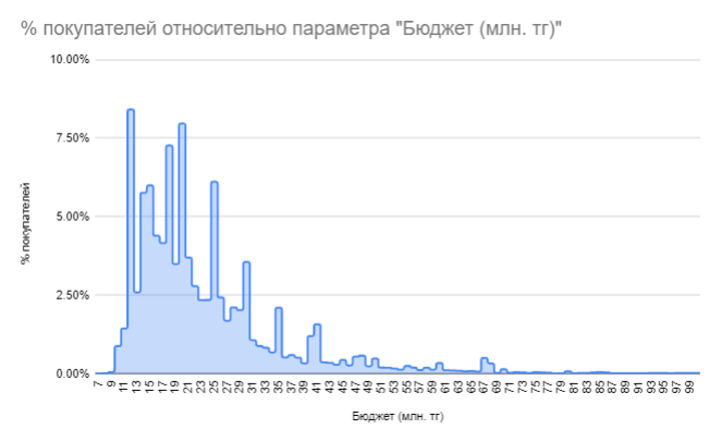 Мы собрали данные о том, в каких ценовых диапазонах искали жилье пользователи нашей поисковой платформы Homsters.kz. Итак, в феврале наибольшее число покупателей интересовалось бюджетной недвижимостью стоимостью 11-12 млн тенге. По сравнению с нашими данными за 2021 год, ценовые предпочтения в 2022 году несколько изменились — потенциальные покупатели начали искать более дешевые квартиры. При этом, значительным спросом пользуется и жилье за 17-20 млн тенге, а также двушки за 24-25 млн тенге.